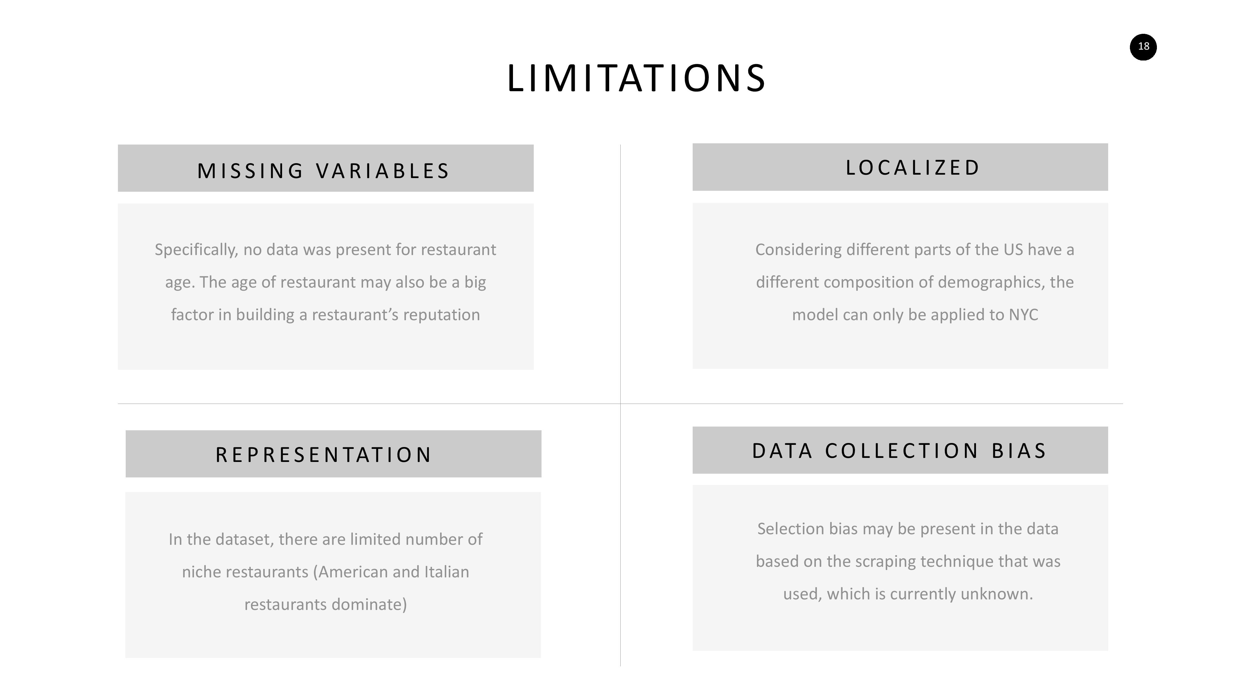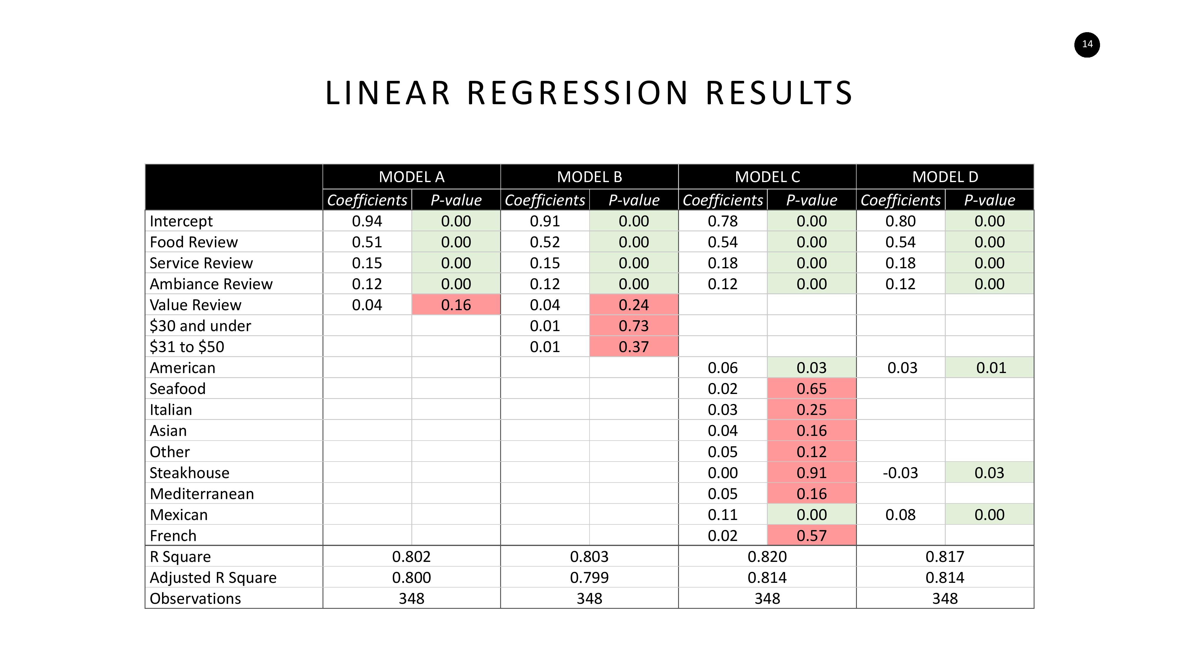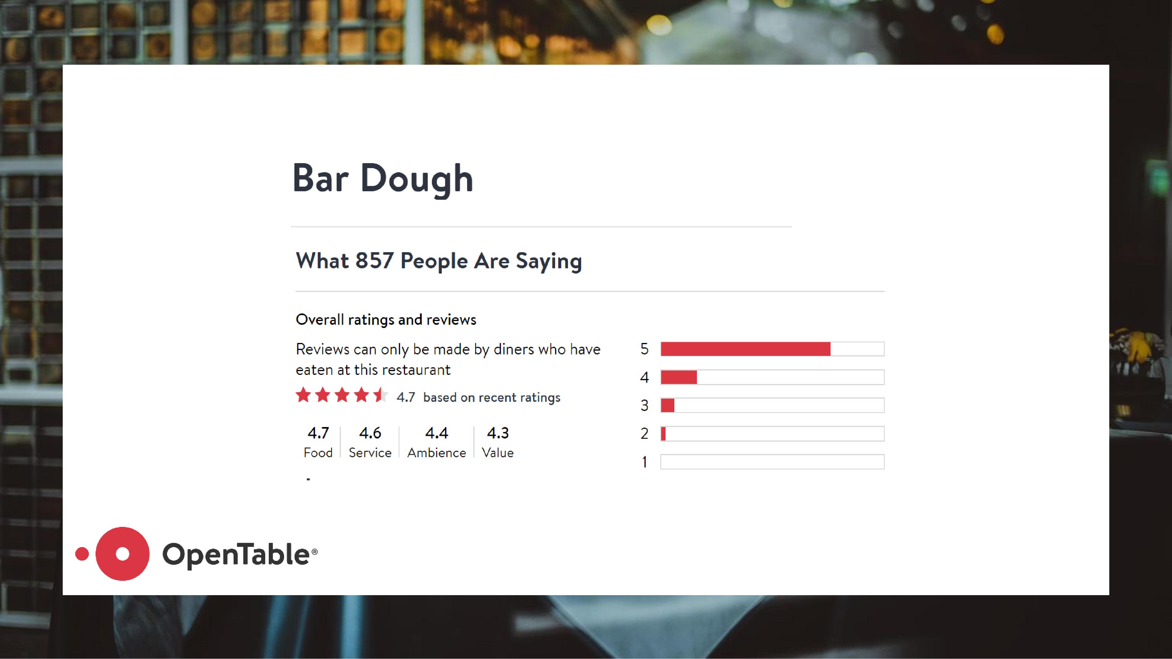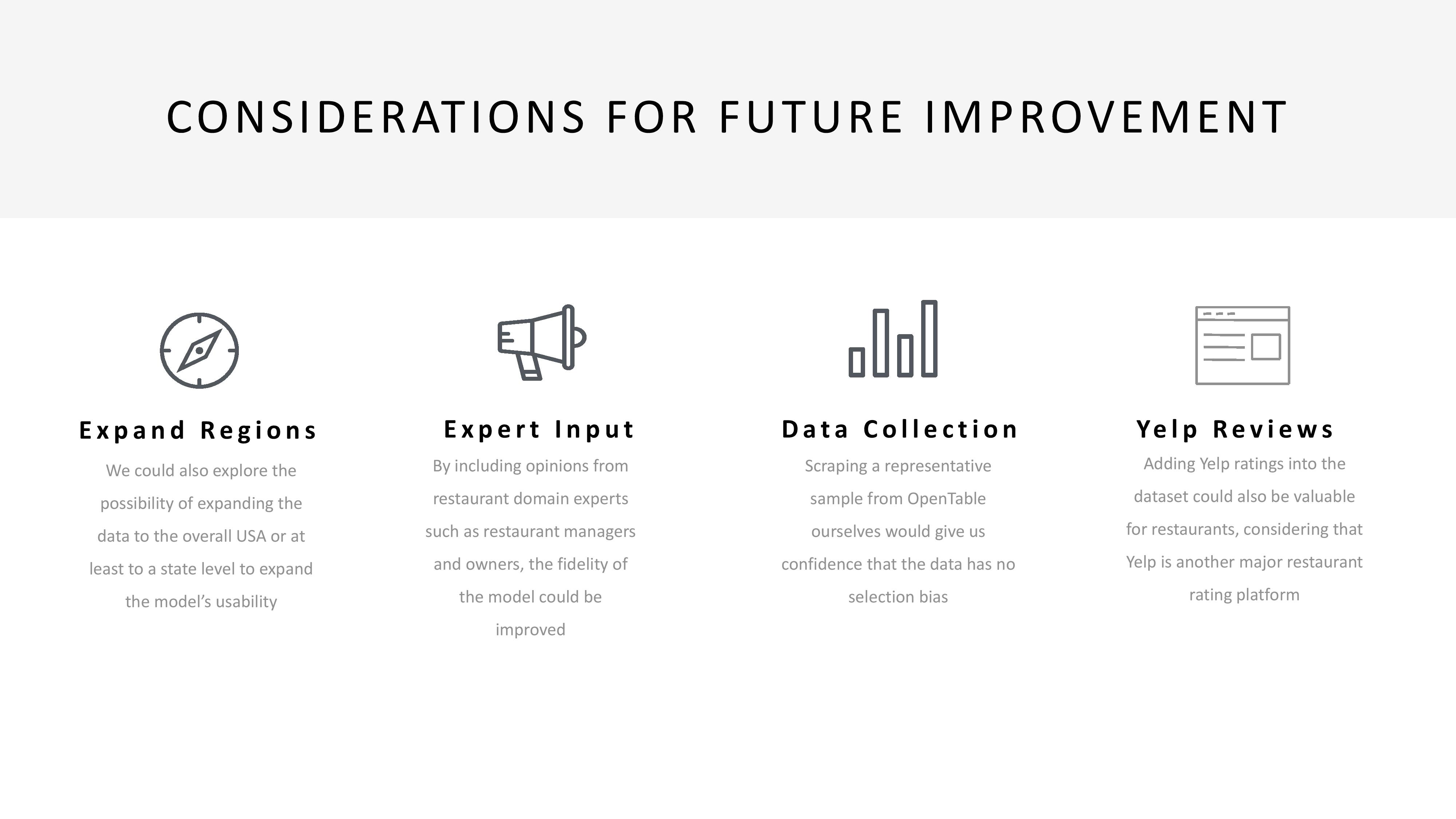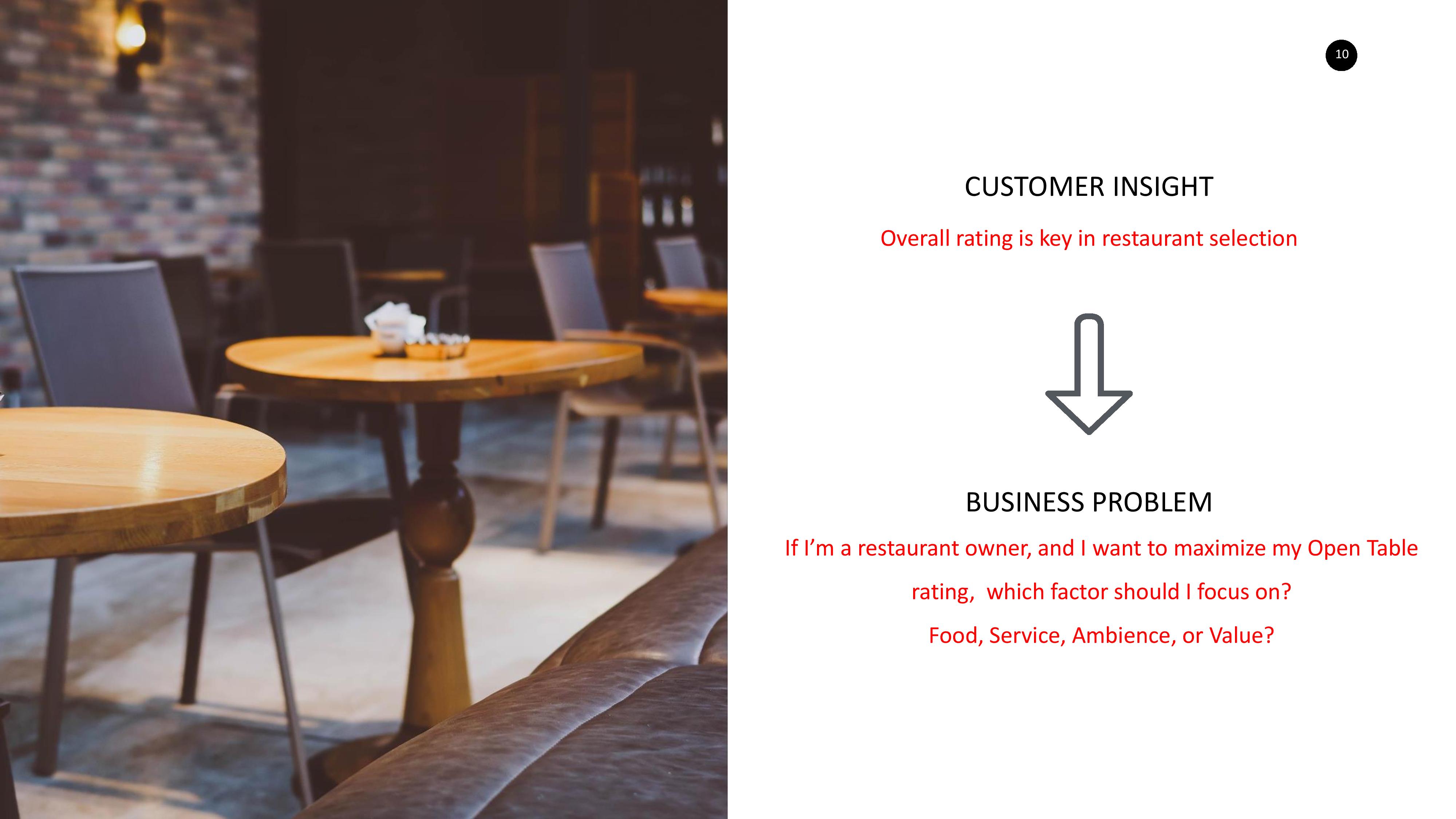 In Spring of 2019, I worked with a team to create a machine learning model that generated some sort of business value. We chose to study how restaurants can maximize their rating on OpenTable. The following is a summary of how the machine learning model was developed, as well as key insights that came out of the model.